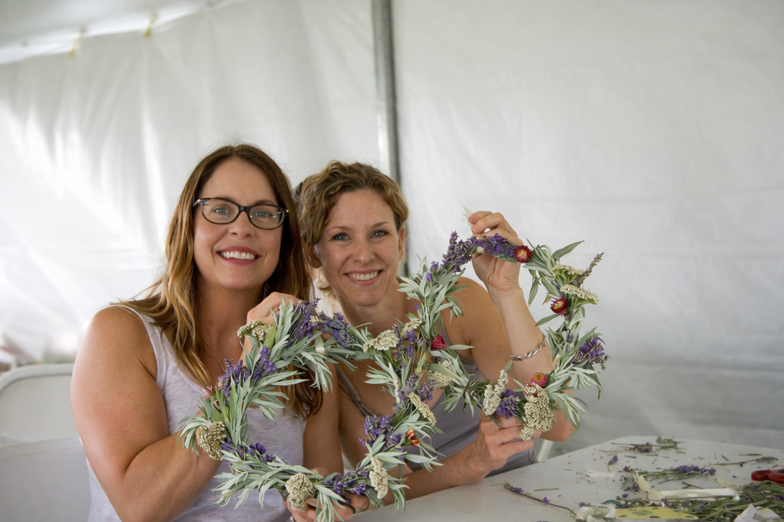 Each wreath begins with a wild grapevine base and is layered with fresh lavender, yarrow, larkspur, statice, celosia, and other seasonal blooms. No experience needed—gentle guidance is provided in a relaxed, unhurried environment.